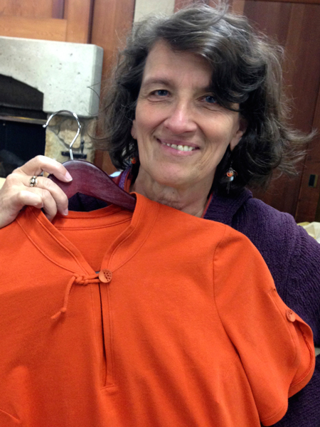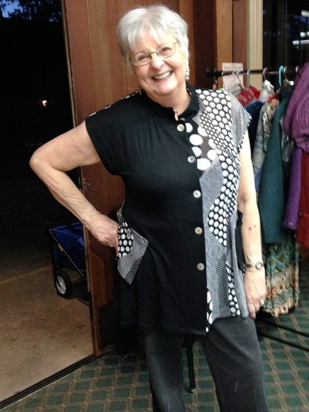 JoAnn finished two tees in combination knits. She learned a new finish for the necklines using lingerie elastic which gives a nice flexible yet firm neck edge. This top is Vogue 9175. |