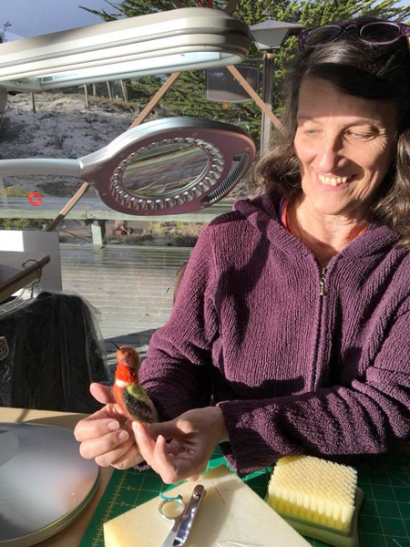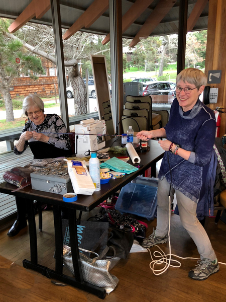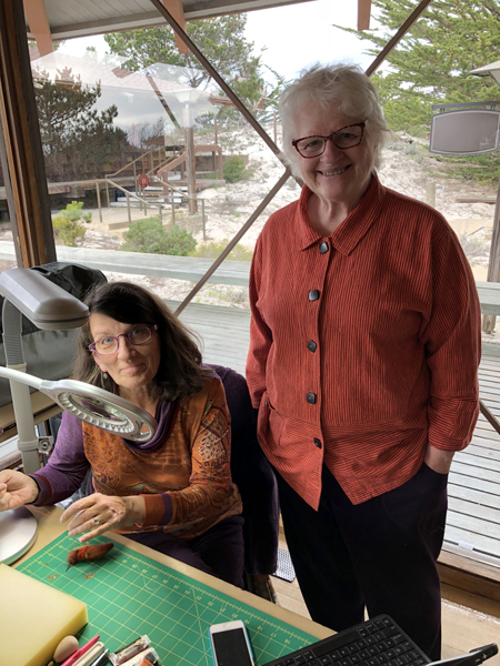 Vicki is showing Sharon how her hummingbird is coming along. |