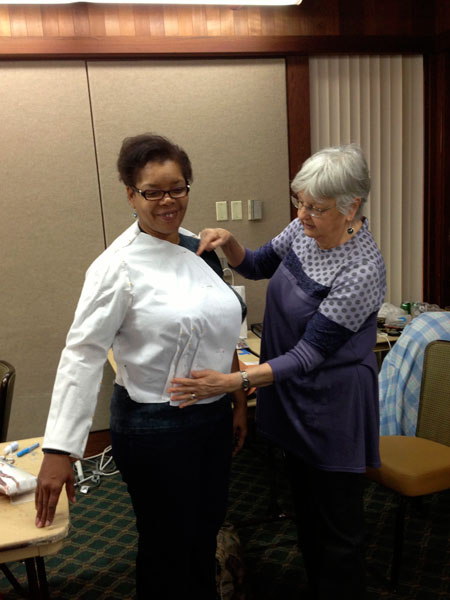 Jane is fitting a muslin on Sandra for a jacket. The Vogue pattern 8621 (out of print) was designed by Claire Shaeffer. I am sure you will see the completed jacket on this website soon. |