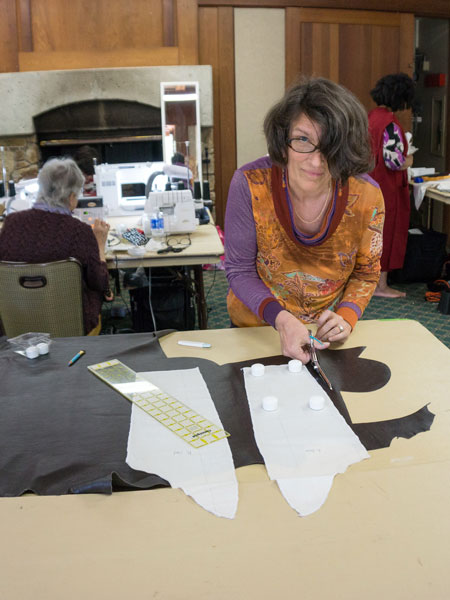 With the last piece of leather being cut, Vicki E is happy the more difficult parts of making this jacket will be done.
