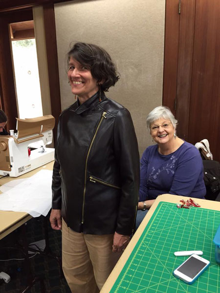 Vicki is reviewing her amazing leather jacket with Jane. The sleeves went in really well and all the zippers are installed. Now she just has the silk charmeuse lining to finish. This is a masterpiece. The leather came from The Hide and Leather House in Napa, CA. |