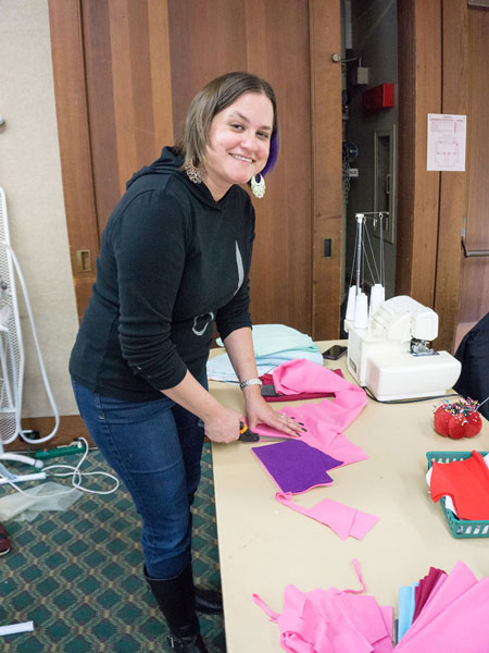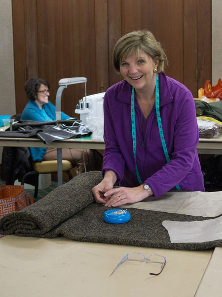 Barbara is getting ready to cut out a coat from a fabric gifted to her by another student. |