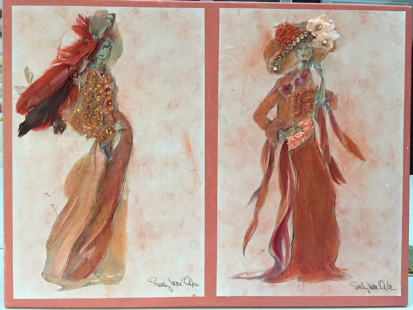Sally painted two gorgeous ladies and embellished with feathers, fabric, and beads. |