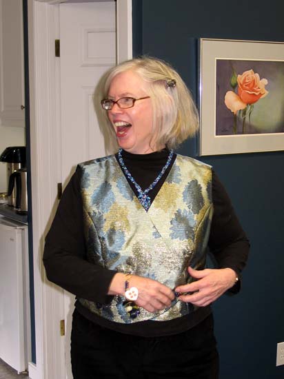 Pat saw a photo in a magazine of a vest she loved, and Jane helped her create the vest. This is her first sewing project, and it is beautiful. Great accomplishment. |