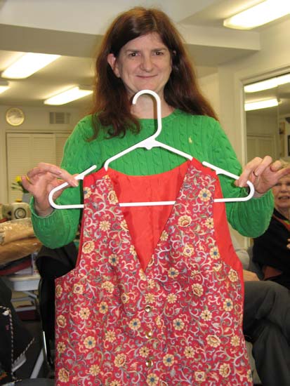 Vicki LOVES the color red and her new lined vest. It will be worn with cropped red pants she is making. The print fabric was a gift from a friend. |