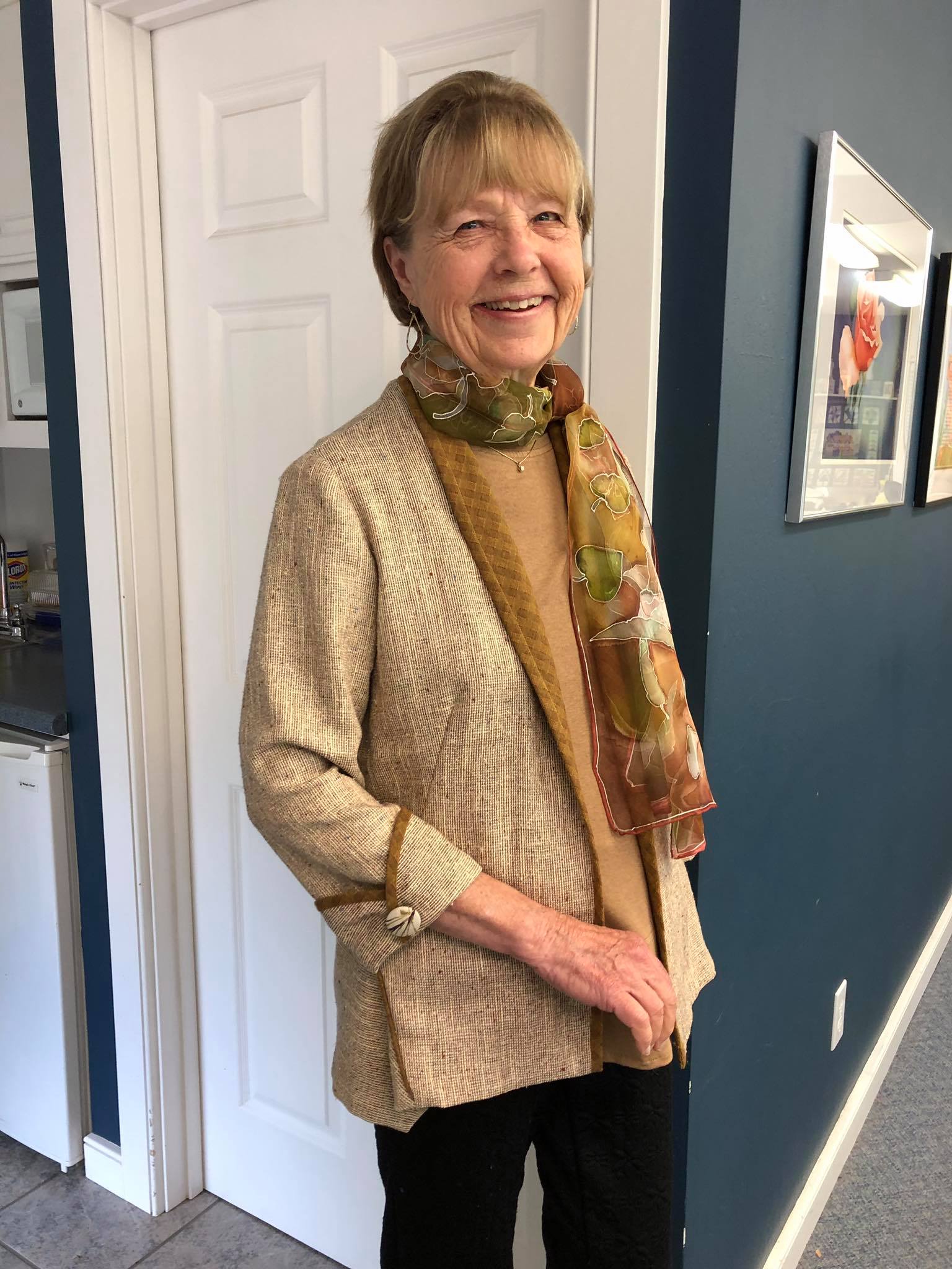 Barbara B is wearing a jacket made in a linen like fabric with slight contrasting trim. She used Vogue V8982 pattern.