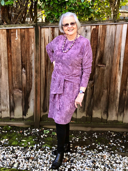 Vicki made this comfortable knit dress using StyleArc's Lacey Dress pattern. The fabric is double sided strip and polka dot. During fitting, Jane took in some soft tucks in the skirt to make it fit closer to her body.