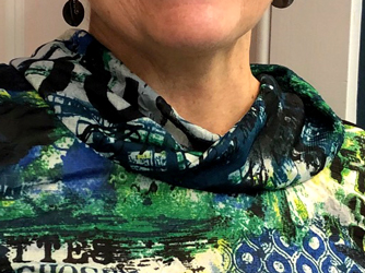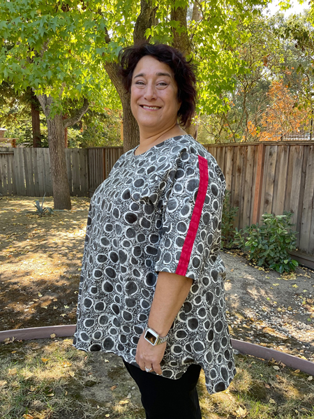Thea looks good in her new top. She used a printed knit and a StyleArc pattern. She added a twisted band to finish the neckline.