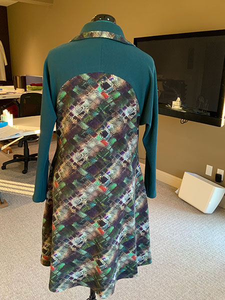 Kathy chose this fabric as a remnant at Britex. It is a good weight and is a woven stretch. She worked an amazing chevron for the center back seam, and did some more matching for the raglan sleeves. I know she loves the comfort of the jacket with the front zipper.