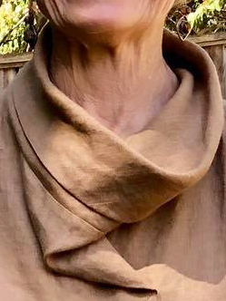 Santina made another top using her own pattern. She and Jane played with the neckline. They cut a strip 8” wide, folded it, and created the twist as it was sewn on by offsetting the edges of the folded strip. It looks beautiful, and nicely fills in the neckline of her pattern,