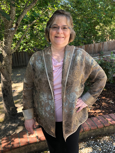 This fun vest is Vogue V9135. Barbara used a shiny rayon, and the drawstring ties are a nice design feature. She’s already enjoyed wearing it on one of her cruises.