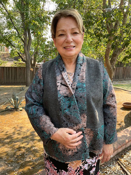 Katherine's couture jacket is stunning. Her beautiful silk jacket has a zippered front opening. The multicolored pink fabric came from Piedmont fabrics.