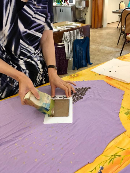 Jasna is silk screening a section of her tee shirt. She will eventually add several different designs in different values of color. |