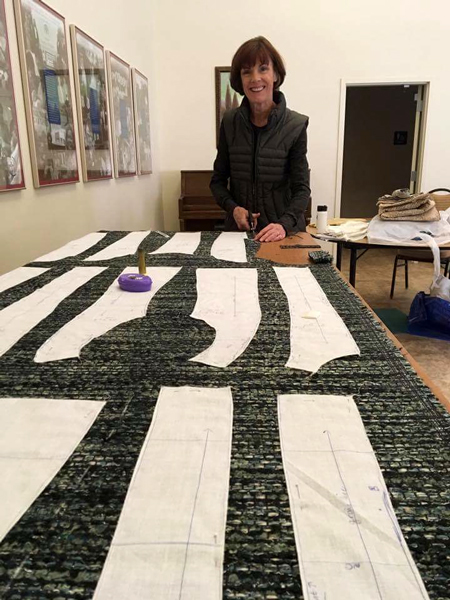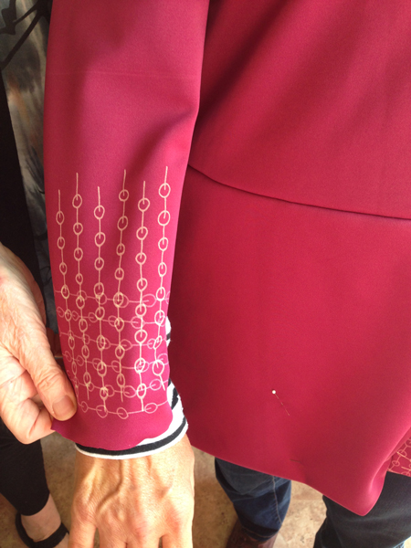 Jeanne has an exciting but scary moment as she cuts into her fabric from New York from Mendel Goldberg. She is making a couture jacket. |