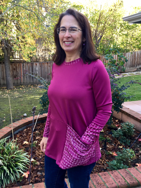 Sally made this really cute top and enhanced the fabric with silk screening details. The pattern is Pearl Knit Top by StyleArc |