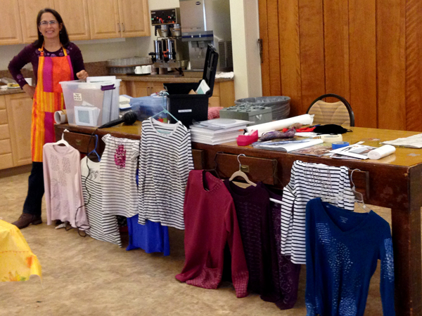 Sally once again generously brought her silk screens and fabric paint for all of us to use, and also displayed some of the tops she had stenciled. You can order her stencils from her Etsy website. |
