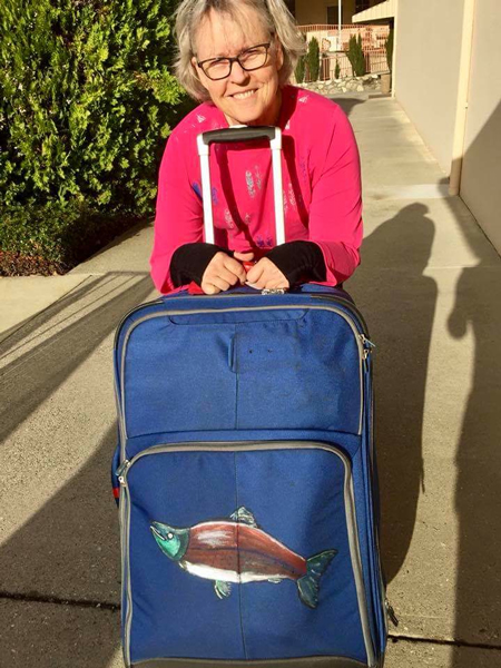 Vicki used fabric paints to depict a coho salmon on her suitcase and allow her to quickly identify her luggage. |
