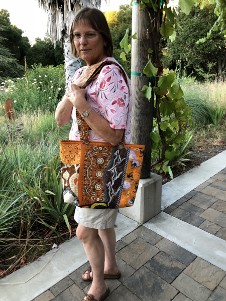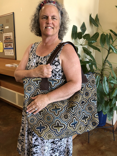 Diana made this tote using a collage of different fabrics and covering the edges with bias strips. The fabric choices are outstanding. |