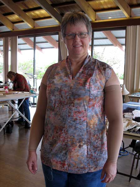 Vicki is ready for Jane's help on this great looking tee shirt. The pattern is #714 V-Neck by Christine Johnson . The princess lines were very attractive on several students. It has a front center seam ending in a V neckline. The front is double faced up to the princess line seam. Her fabric came from Emma One Sock. |