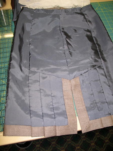 This shows the preparation for the waistband on Vicki's Marfy skirt. The back of the waistband is interfaced lining with rows of channel stitching for support. The front is well interfaced fashion fabric which has been curved slightly with a steam iron. |