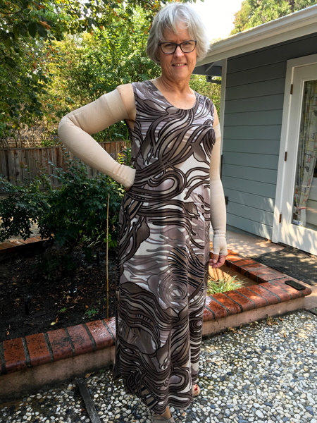 Janice looks cool in this summer shift. We put a few tucks in the knit fabric to give the shift more shape. She used McCalls M6074 pattern. |