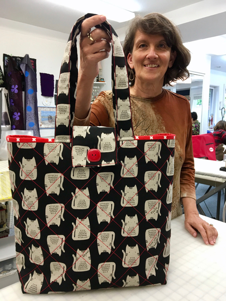 Ellen bought this cool cotton in a quilt store in Auburn while she was at the Auburn Sewing Retreat. It is a border print. Ellen used her own pattern and made pockets out of woven strips of the fabric. |