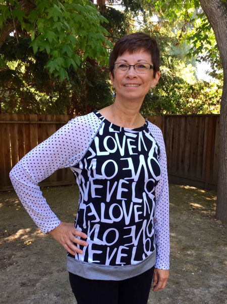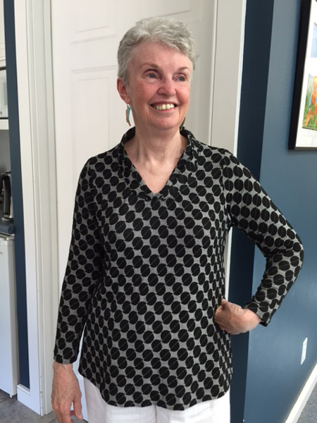 Liz just finished this tee using Vogue pattern V8793 designed by Katherine Tilton. The pattern uses zippers on the neck collar, and Liz opted not to use them this time. The fabric was purchased online from Marcy Tilton. |