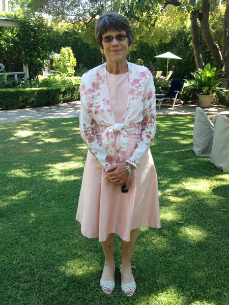 JoAnn made an attractive rayon dress with fabric from "Fabrics R US" in San Jose. The pattern is "See and Sew" Butterick 5768. |