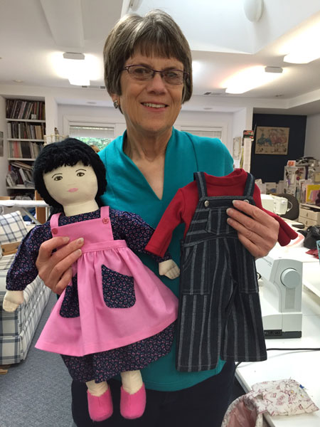 Roberta not only made her knit top, she also made this lovely doll and lots of clothes for her best friends' granddaughter. The dolls clothes were made from left over scraps from garments she had created. |
