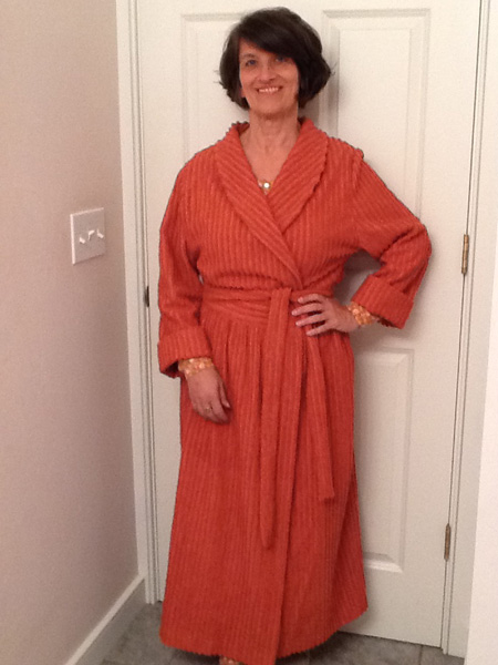 Vicki has a new cuddly and warm robe. She used a piece of silk in the neck edge for added luxury. Great job. |