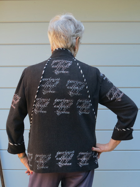 Jane made some changes to Marcy Tilton's Vogue 8982 jacket. She'd screened a design onto the black silk noile. The buttons are from Sawyer Brooks. |