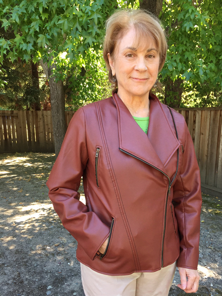 Lark looks stunning in her new MotorCity Express jacket by Islander patterns, Fabric is faux leather and came from Gulf Fabrics. It is called Brisa which is described as a luxurious simulated leather engineered for breathability. The pin marks don't show when stitching, and it can be washed. |